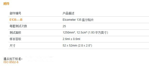 Elcometer 135B Bresle 盐分贴片用来测定表面氯化物污染含量,是一种自粘型的橡胶薄膜片,带一块密封空间,用于取样,样本是取自钢铁表面、带相应溶剂的可溶性杂质。