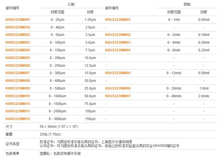0 至 25μm 和 0 至 3000μm (0 至1mil 和 0 至 40mils) 几种不同的测量范围可选。